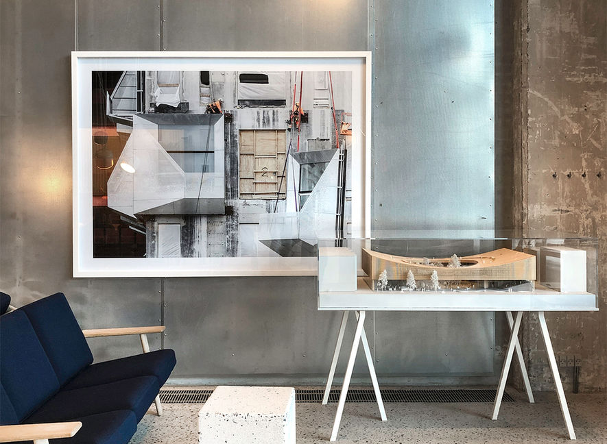 COBE Architects - HQ Studio in a converted warehouse by Dan Stubbergaard on the waterfront of the dox , one of the most impressive new bustling city district of Nordhavn, in Copenhagen. Retaining as much of the old harbour heritage atmosphere as possible, raw concrete walls, floor-to-ceiling windows, large columns, the office is designed as a village with small houses and plazas that allows for both formal and informal meetings, and a coffee Bar with exibitions of project from the studio, open for all, visitor, neighbourhood and turists.